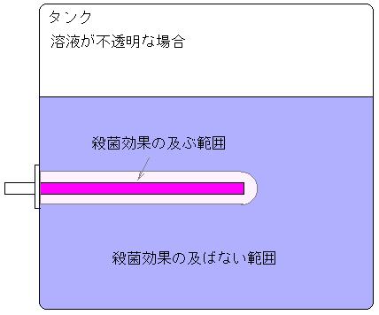 下図の様に殺菌有効距離が極端に短くなるためにこの手法でのタンク内溶液の殺菌は不向きとなります。